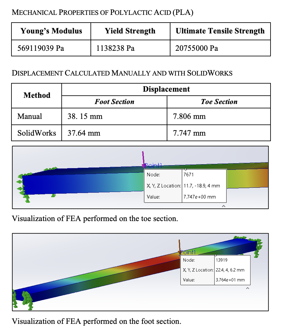 An FEA was performed by the SolidWorks simulator on the modified design to test the stiffness. The displacement reduced as intended, and the redesign was 3D printed to be tested on a CellScale machine, with a 190N force applied at the ankle.